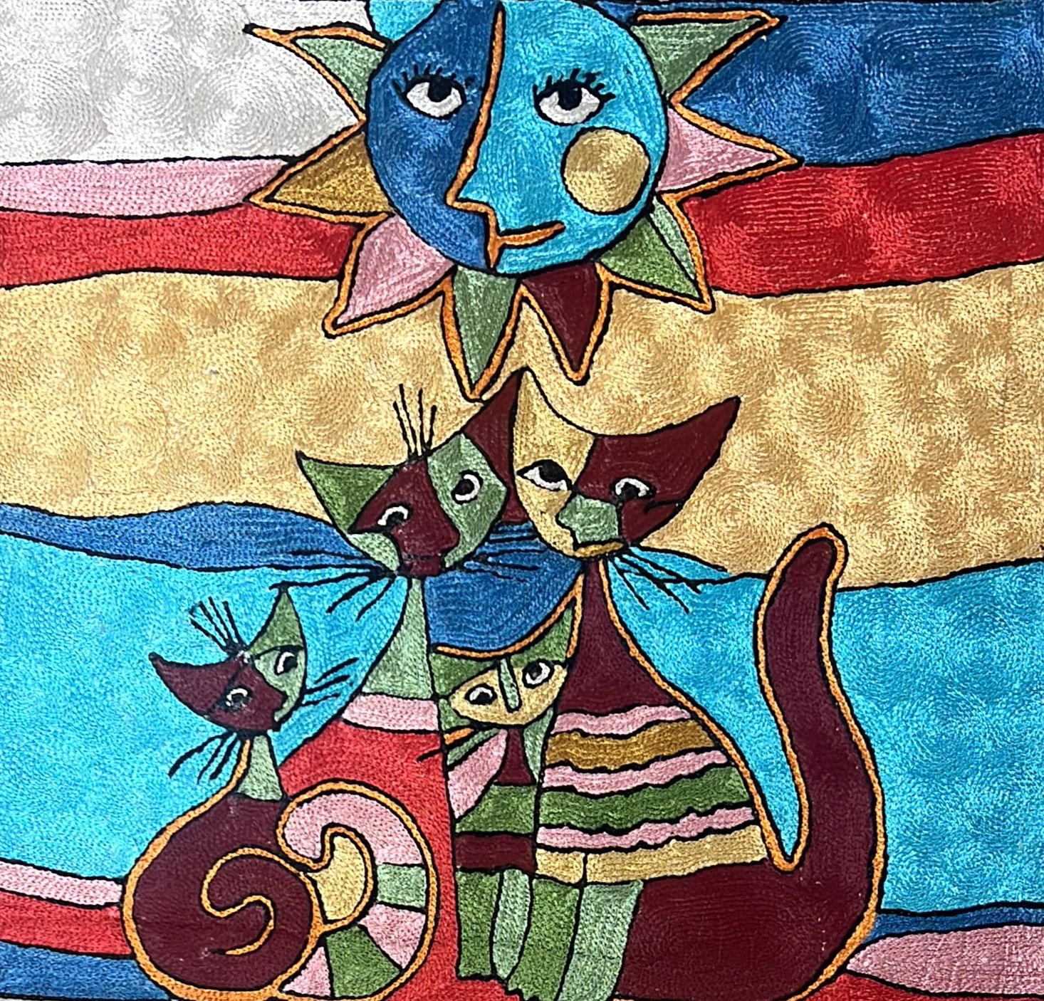 Design: Bold abstract cats and a playful sun in bright, contrasting colors.
