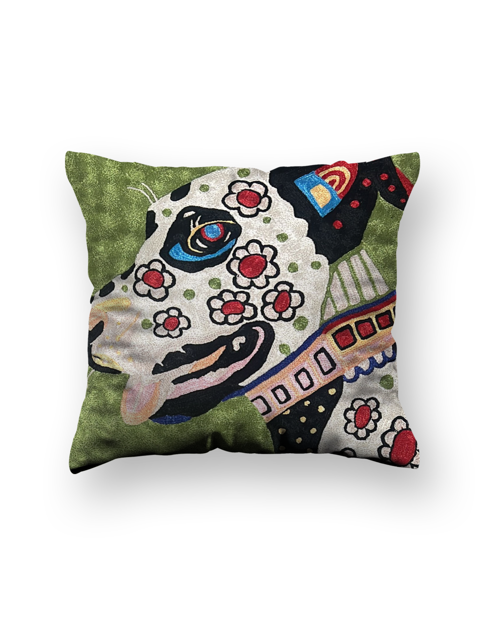 Colorful cushion with a cheerful dog face design.