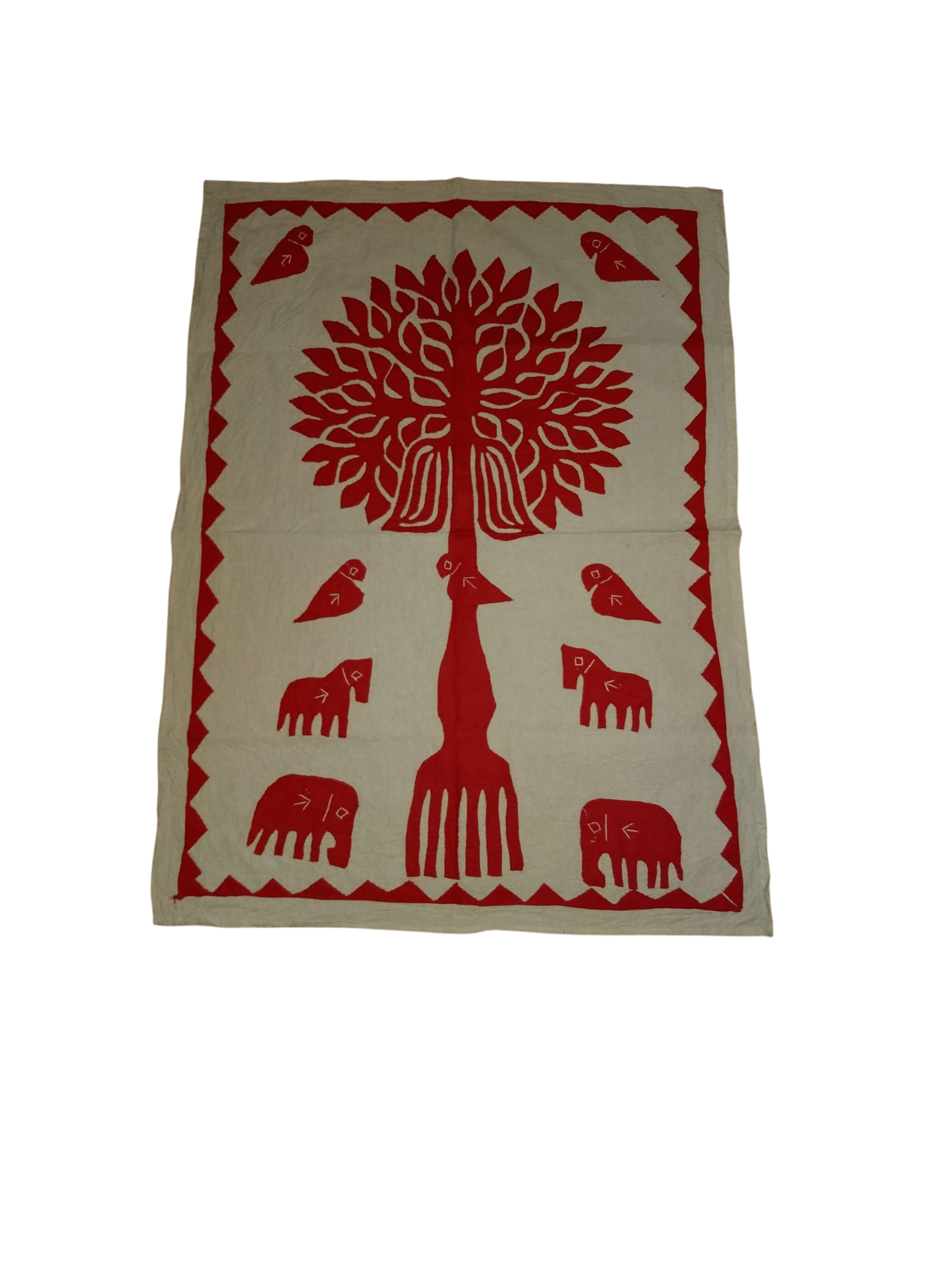 This handcrafted appliqué wall hanging captures the raw beauty of tribal art with its bold red-on-white design. Featuring symbolic elements like trees, birds, and elephants, it reflects harmony with nature and traditional storytelling through fabric. Its simplicity blends perfectly with both contemporary and ethnic interiors, making it an elegant choice for hallways, entryways, or meditation spaces. A unique décor piece that connects art with culture.